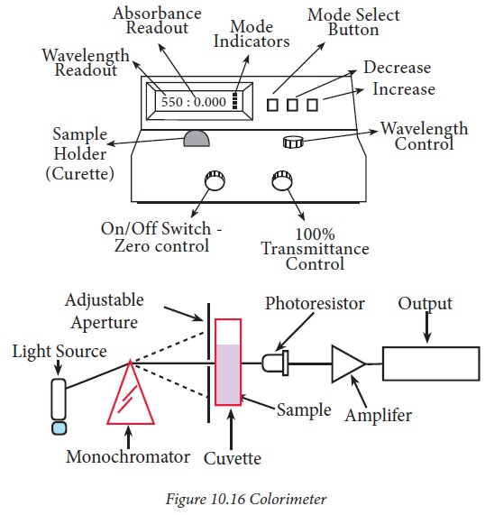 A colorimeter has 3 main components. As seen in the given figure, incident light from a light source passes through a monochromator, which allows only light of a specific wavelength (say 600 nm) to pass through. The specific monochromatic light reaches the sample placed in a cuvette. By comparing the color intensity between the sample and a reference sample, one can calculate the absorbance of the light and the concentration of the solution. Finally, the photo receptor converts light energy to electrical energy. The reading is then amplified by an amplifier before it shows up on the colorimeter.
